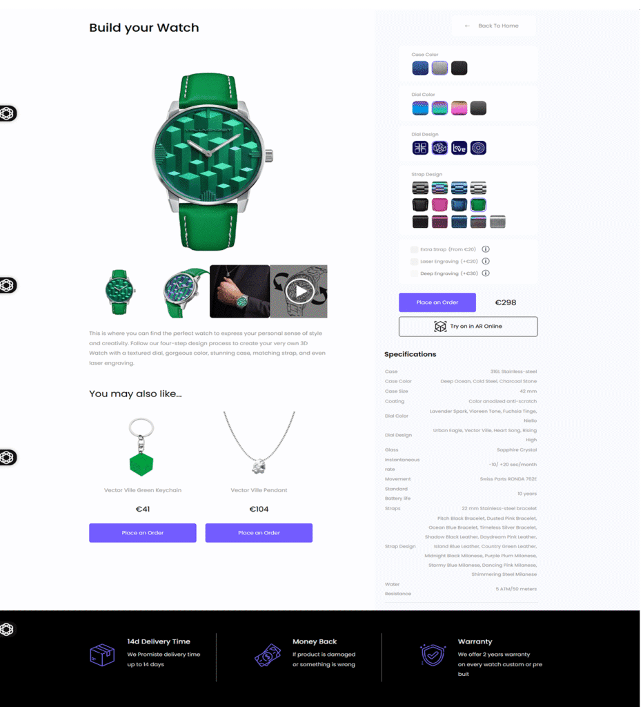 - Interactive Design Panel: Effortlessly customize the front, back, and strap of your watch with a sleek, user-friendly interface.